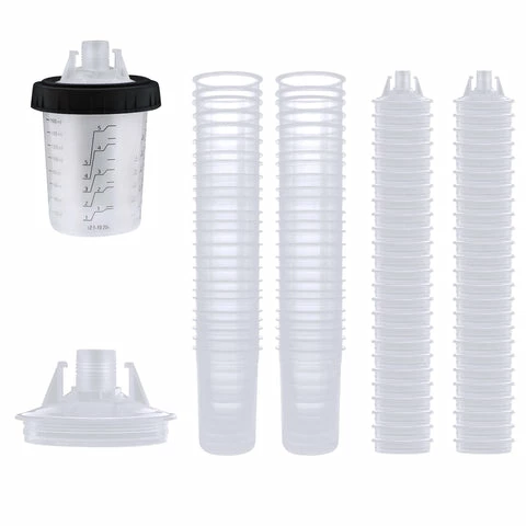 - [Contents]: Automotive paint gun accessories kit includes 50 disposable gravity spray gun cup liners, 50 lids, 20 sealing plugs, 1 hard cup, and 1 retaining ring; Paint cup liners hold up to 6 ounces (0.2qt) of liquid