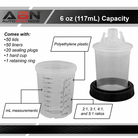 - [Accurately Measure and Mix]: Prepare your spray paint and administer it with the ABN 50 Pack Plastic Paint Cups Liners Kit; The auto paint cup features mL measurements and 2:1, 3:1, 4:1, and 5:1 ratios