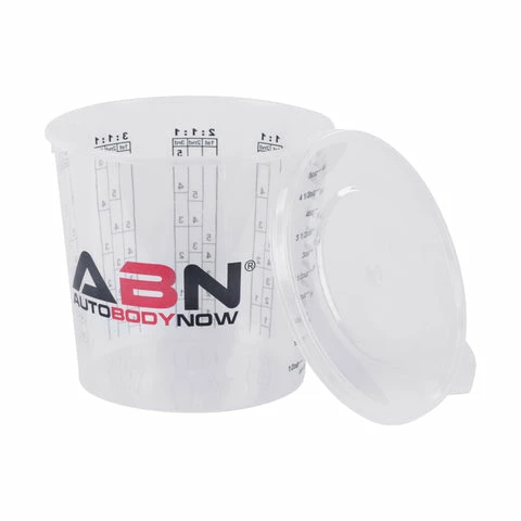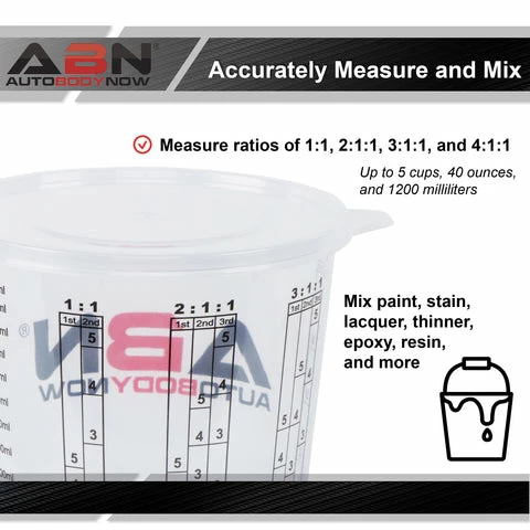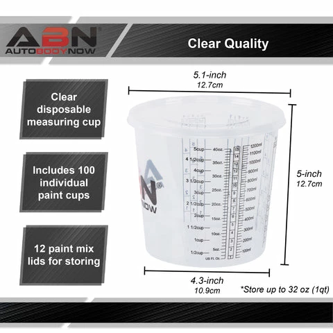- [Fill, Stir, and Pour]: Measure, mix, and pour paint with the ABN 100 Pack Plastic Measuring Cups for Liquids; 12 plastic paint mixing cup lids allow you to even store up to 32 ounces (1qt) of paint easily