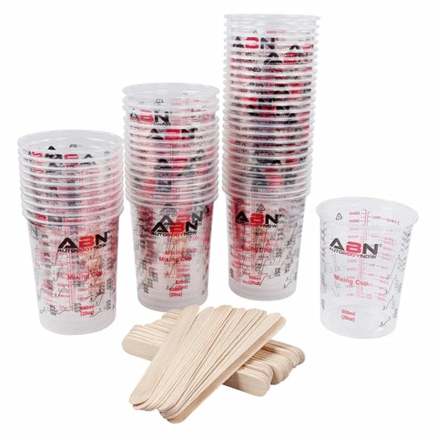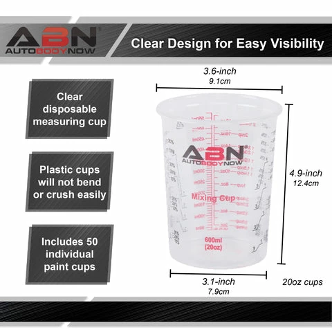 - [Accurately Measure and Mix]: Use the ABN 50 Pack Auto Paint Mixing Cup Kit to precisely measure out materials for any project; Use the black measurement lines for percentages and ratios and red measurement lines for cups, milliliters, and ounces