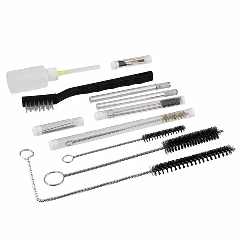 - [Package Contents]: Gun cleaning kit includes long handled angle wire brush, long handled straight wire brush, medium sized wire brush, medium sized Brass brush, fine brushes, fine point cleaners, hobby knife holders, plastic handled brush, detail brushes, bottle for cleaning solution